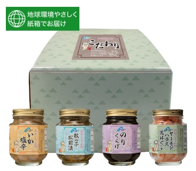 おやじさんのこだわり【C】(いか塩辛175g/数の子松前漬155g/のりくらげ185g/サーモンハラス荒ほぐし100g) 化粧箱込