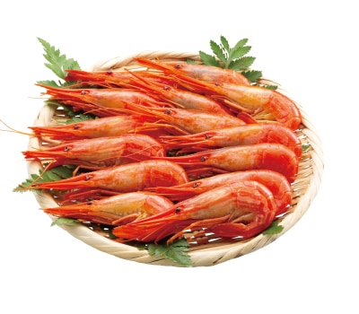 水揚げされた北海しまえびは透明感があり、若干黄緑がかった色をしていますが、塩茹で上げると真っ赤に変わります。