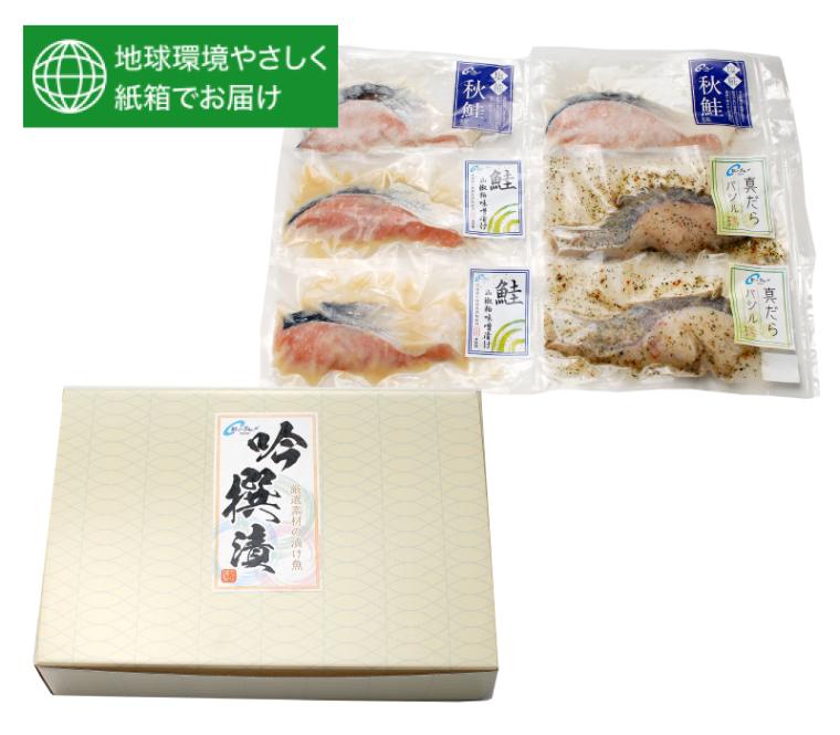 「北のグルメ」が自信をもって作った「漬魚」のセットです。 どれも原料、味噌、加工にもこだわり、最高の旨味をお楽しみいただけます。BOX入りでギフトにもおすすめです。 【セット内容】 秋鮭塩糀・鮭山椒粕味噌漬・真だらバジル 各2個 計6切入り