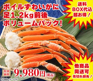 ※数量限定 人気商品ずわいがに足を【特別企画】「ずわいがに足(1.2kg前後)・ボリュームパック」でご奉仕!通常商品価格11,960円を送料込・BOX代込で9,980円とってもお買得です。他商品も同送可 この商品は他商品同送も可能なので、他のお買い物と合わせてもっとお得に! ※送料・BOX代込! ※他商品も同梱できます。 ※各種割引対象外となります。