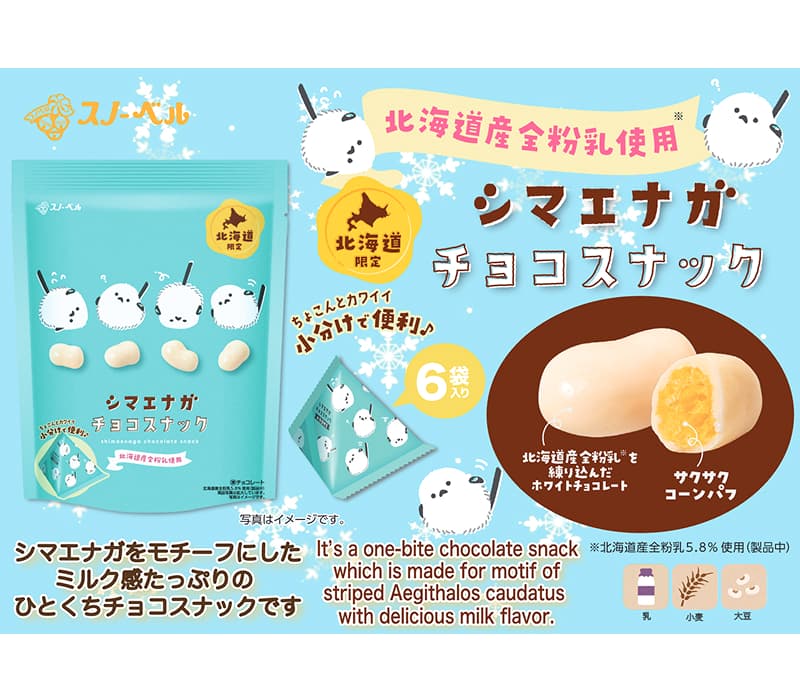 今や絶大な人気を誇るシマエナガ。雪の妖精と称され、愛らしいその姿をモチーフにしたお菓子が、北海道限定の「シマエナガ チョコスナック」です。香ばしいサクサクしたコーンパフを、なめらかなホワイトチョコレートで包みました。丸いフォルムが可愛いらしく、さらに美味しい。手土産にも最適です。